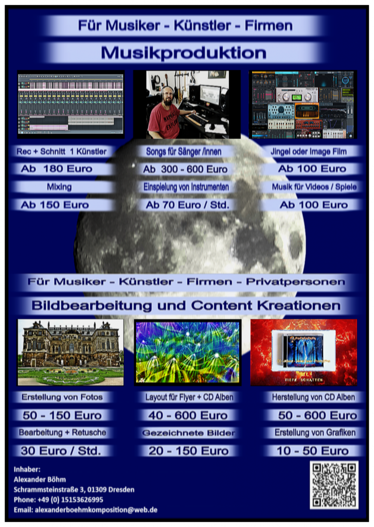 Inhaber: Alexander Böhm Anschrift: Schrammsteinstraße 3, 01309 Dresden Phone: +49 (0) 15153626995 Email: alexanderboehmkomposition@web.de